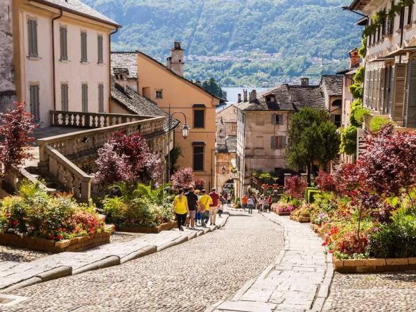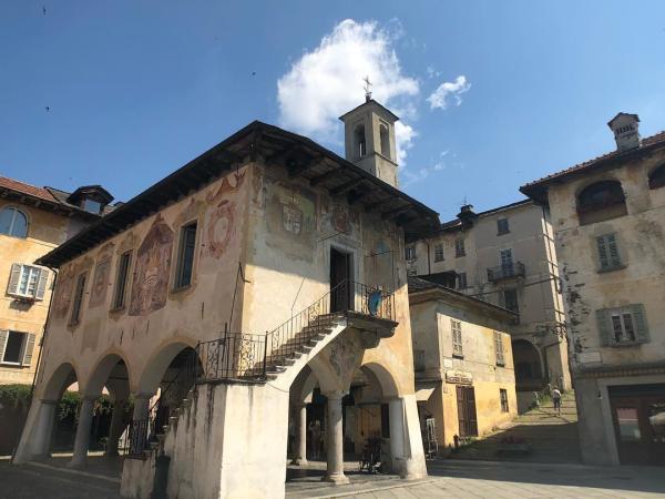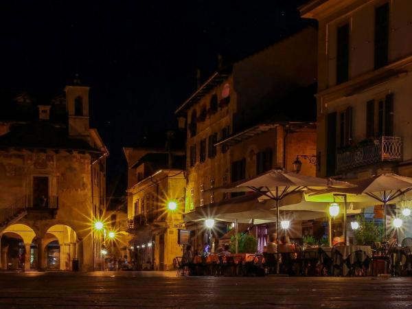 Das pulsierende Zentrum des Lebens in Orta ist ein wahrer Salon unter freiem Himmel mit Blick auf den See. Der rechteckige Platz wird an seinen Längsseiten einerseits von einer Reihe bunter historischer Fassaden und andererseits vom Seeufer selbst begrenzt, wo die Fähren zur Insel anlegen. Es ist sehr angenehm, den Blick auf den See und die umliegenden Berge zu genießen, mit der Insel im Vordergrund, während man bequem auf den Bänken sitzt, die im Schatten großer Bäume liegen. In der nördlichen Ecke steht das Gemeindehaus, ein wunderschöner Broletto aus dem 16. Jahrhundert.