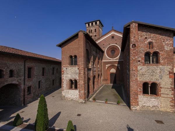 Die zwischen 1040 und 1053 gegründete Abtei ist einer der bedeutendsten Klosterkomplexe im Piemont. Sie besteht aus einer Umfassungsmauer mit runden Ecktürmen, einem hohen romanischen Glockenturm, einer Kirche im lombardischen Gotikstil und einem eleganten Kreuzgang mit einem Freskenzyklus aus dem 15. Jahrhundert, der den Geschichten des Heiligen Benedikt gewidmet ist. Die Lage in der Region war im 13. Jahrhundert recht instabil und gefährlich, weshalb die Abtei, was für Komplexe in der Ebene eher ungewöhnlich war, befestigt wurde, indem man sie mit einem Graben und Mauern umgab, die durch mächtige Ecktürme verstärkt wurden, und sie so in einen Zufluchtsort für die Dorfbewohner verwandelte. Hier hatte der massive Glockenturm nicht nur eine Verteidigungsfunktion, sondern stellte auch die letzte Zuflucht im Falle einer Belagerung dar.