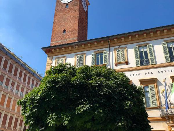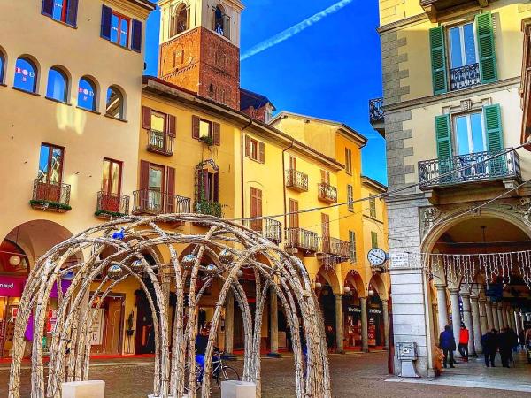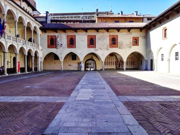 Dieser kleine, elegante Innenhof ist das historische Herzstück der Stadt. Der mittelalterliche Komplex besteht aus vier Gebäuden, die zu unterschiedlichen Zeiten erbaut wurden und sich in ihren architektonischen, dekorativen und künstlerischen Elementen unterscheiden. Der Palazzo dell'Arengo mit seinen Rundbögen und der Palazzo dei Paratici (Zünfte) mit seinem eleganten Portikus mit Loggia stammen aus dem 13. Jahrhundert. Der Palazzo del Podestà und der Palazzo della Referendaria hingegen stammen aus dem späten 14. bis frühen 15. Jahrhundert.